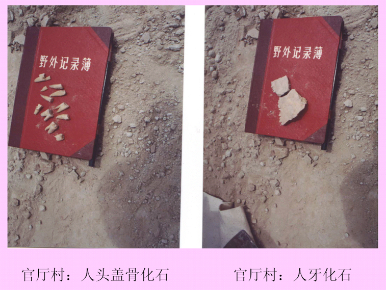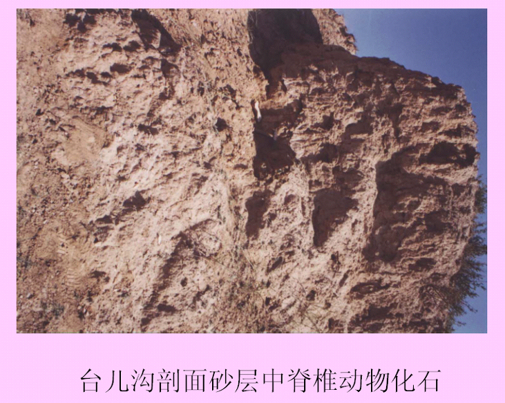 采集到较多哺乳动物化石和遗迹化石。①在官厅的泥河湾组上部地层中,找到被压碎的人头盖骨化石数片,人牙齿 10多枚。② 在台儿沟剖面泥河湾组中部河流相或三角洲相黄色砂层中发现较多大脊椎动物化石肢骨和颈骨(牛?象?)以及啮齿类化石。③ 在台儿沟剖面顶部黄土中发现较完整的中华鼢鼠头骨化石。④ 在台儿沟剖面下部发现生物遗迹化石和呈长柱外表有爪痕的遗迹化石。